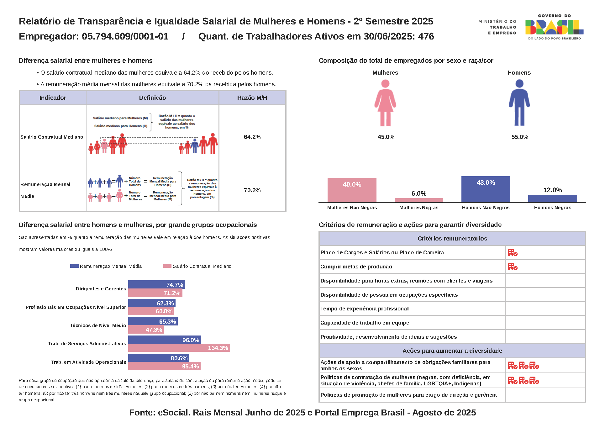 Em cumprimento à Lei nº 14.611 de 04 de Julho de 2023, à Portaria MTE Nº 3.714 ao Decreto nº 11.795/2023, bem como aos compromissos com a promoção de práticas de inclusão e diversidade, divulgamos o relatório transparência e de igualdade salarial da empresa.